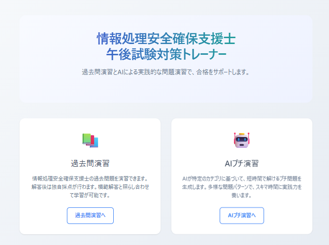そこで、約1ヶ月半かけて情報処理安全確保支援士の午後試験を演習&採点できるサイトを開発しました。