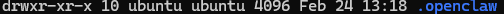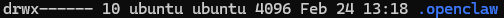 実際にサーバ内で .openclaw ディレクトリを確認すると、指摘通り権限が 775 になっていました。
