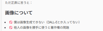 画像生成のクオリティも知りたいと思い聞いてみたところ、画像は直接生成できないとのことでした。